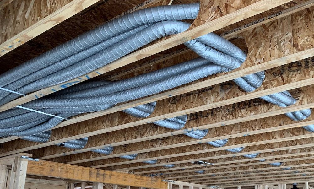 Rheia is a proprietary “home run” system that ensures predictable airflows to create a balanced environment throughout the home.As a small-diameter duct system, Rheia can be located entirely in the home’s conditioned spaces, routing the ductwork through conventional 2 x 4 walls, I-joists, and open web trusses. This cannot be done with conventional ductwork, which requires costly and unsightly framing to accommodate bulky ductwork.